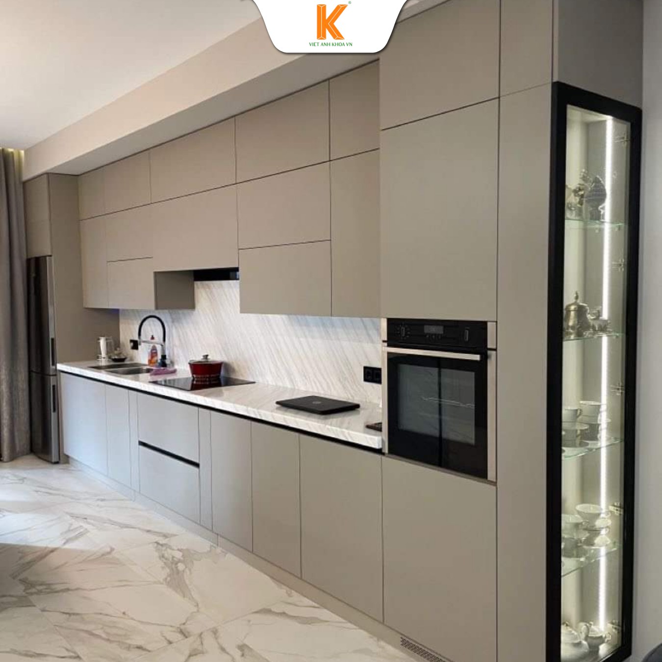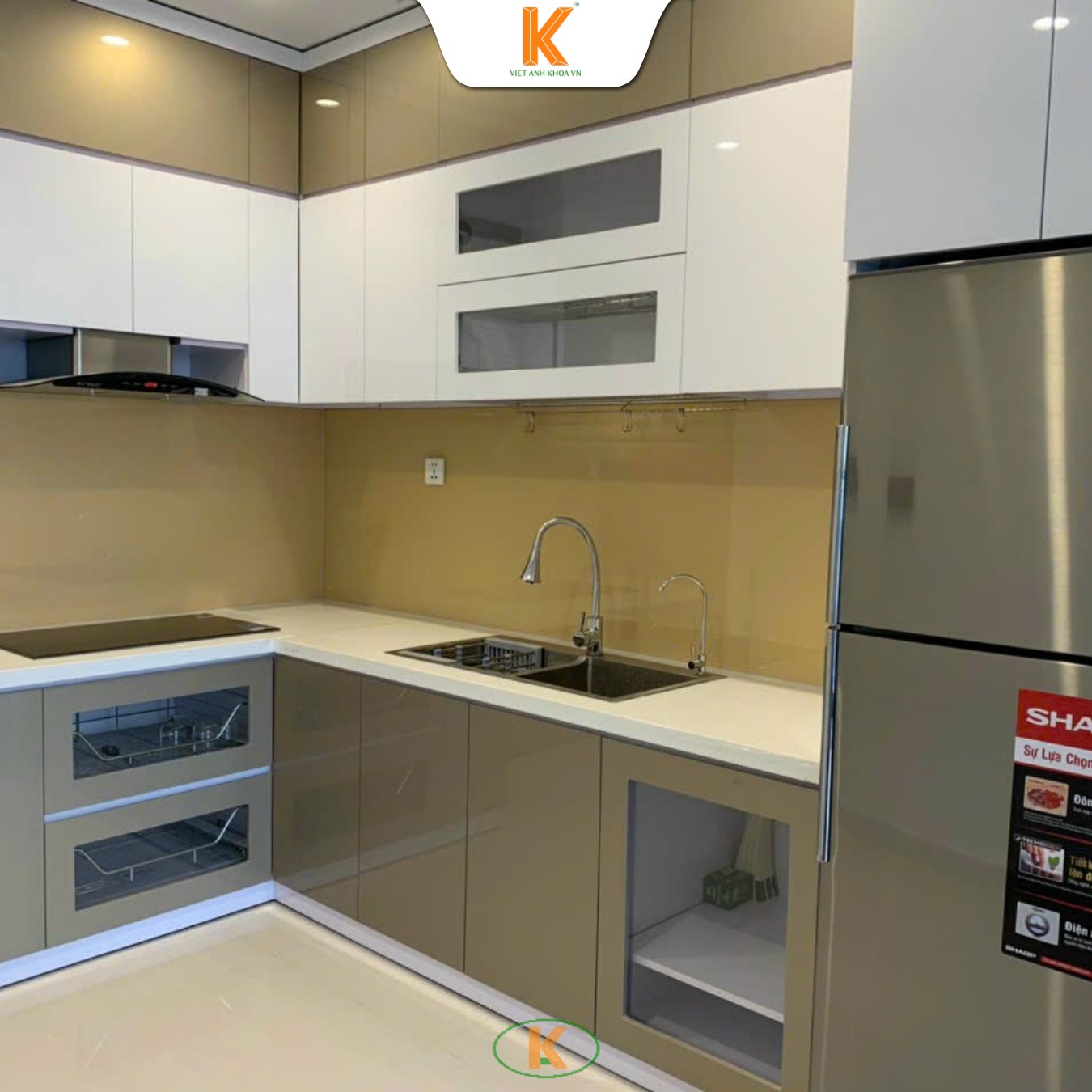 Ngoài phần tủ chính, quá trình thi công còn bao gồm lắp đặt các phụ kiện nhà bếp như bản lề giảm chấn, ray trượt, kệ đựng chén bát, kệ gia vị, thùng gạo hoặc giá xoay góc tủ. Những phụ kiện này giúp việc nấu nướng trở nên thuận tiện và giúp không gian bếp luôn gọn gàng.
